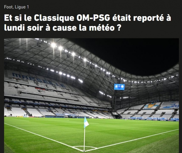 9月21日讯 《队报》报道,由于法国气象局预告马赛市将遭遇强雷暴天气,原定北京时间周一凌晨2点45分举行的法甲第五轮收官战马赛对阵巴黎圣日耳曼的比赛可能延期。
