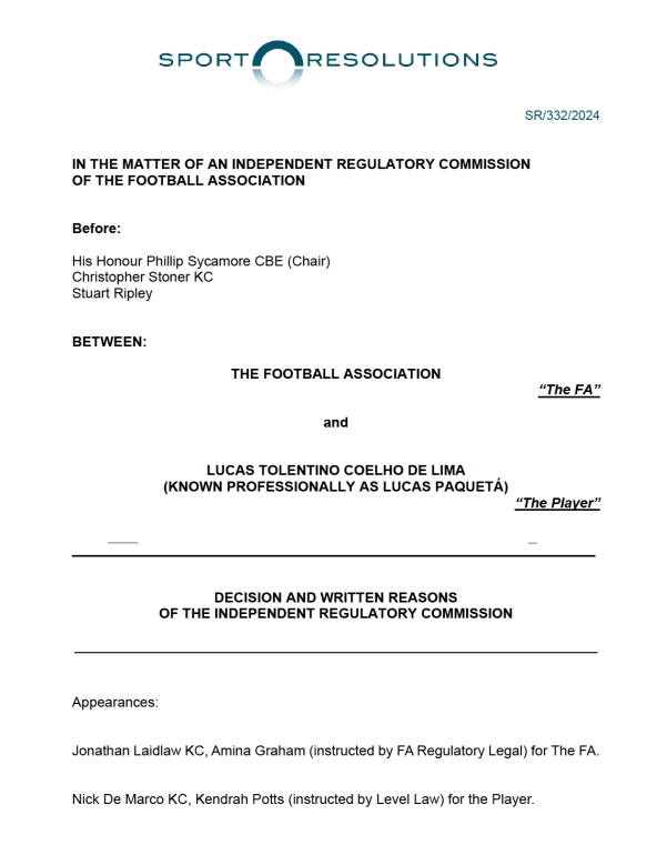 在谈到帕奎塔为西汉姆效力时收到的四张黄牌时,英足总指控这名中场球员“直接试图影响这些比赛,故意寻求从裁判那里得到黄牌,以达到影响博彩市场的不正当目的,以便一个或多个人从中获利”。